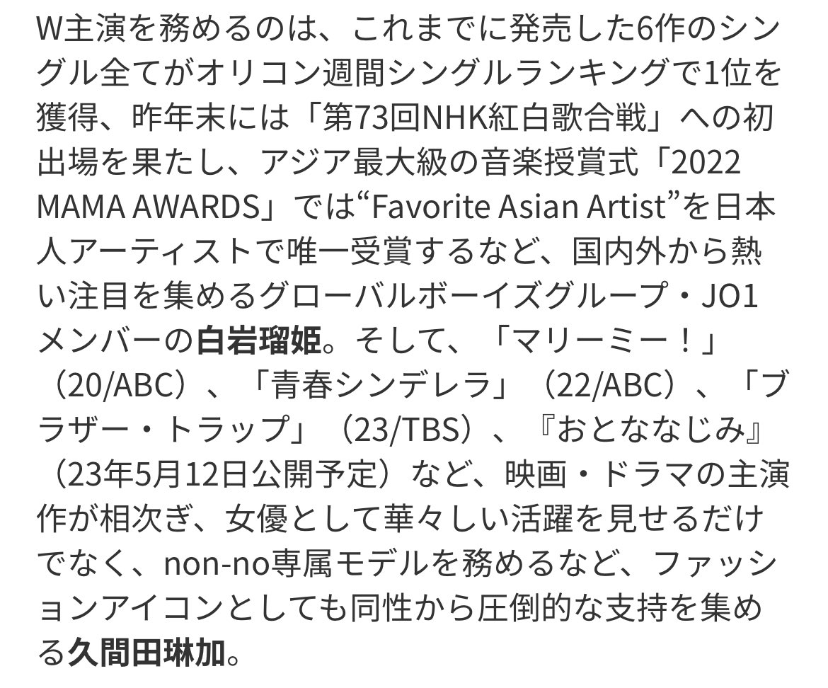 「国内外から熱い注目を集めるグローバルボーイズグループ・JO1メンバーの白岩瑠姫」瑠姫くんの紹介文がオリコン、紅白、MAMAにまで触れられていて、これまでJO1が積み重ねてきたものが確実に生かされているんだなと…うれしいですね