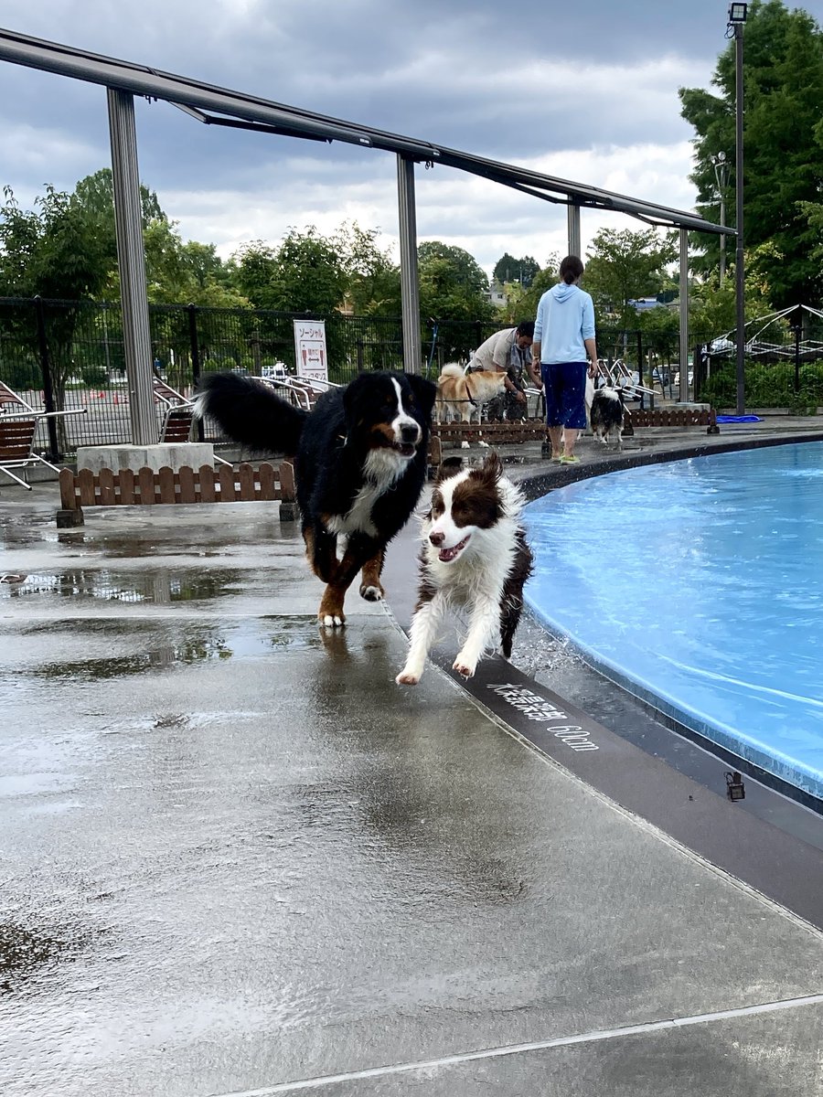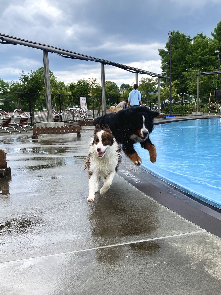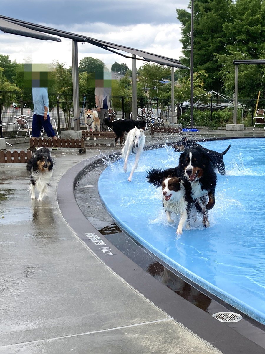 9万いいねありがとうございます🌟 ボルゾイは足を滑らせていたようですが、持ち前の身体能力の高さでプールに落ちることはなく、走り続けていました!👏 こちらはみんながジャンプする直前の写真です(直後は写真なし)。みんな楽しそうで、その様子が伝わって嬉しいです☺️