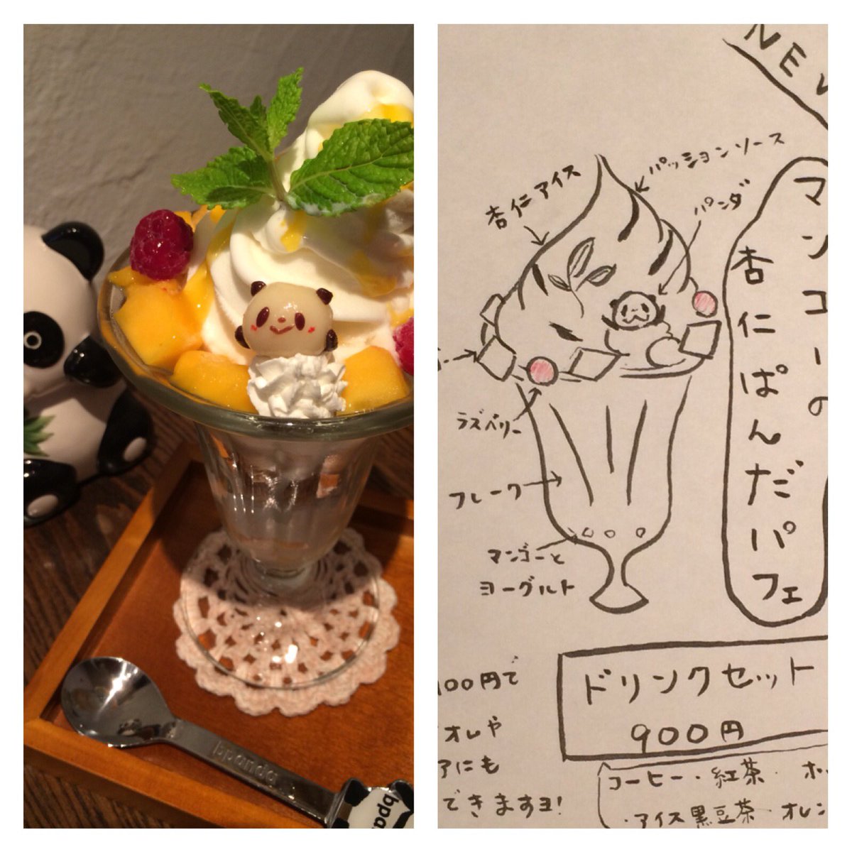 新メニューのパフェ、決定しました。『マンゴーの杏仁ぱんだパフェ』ドリンクセットで900円です☆今週末あたりから登場予定ですよ!