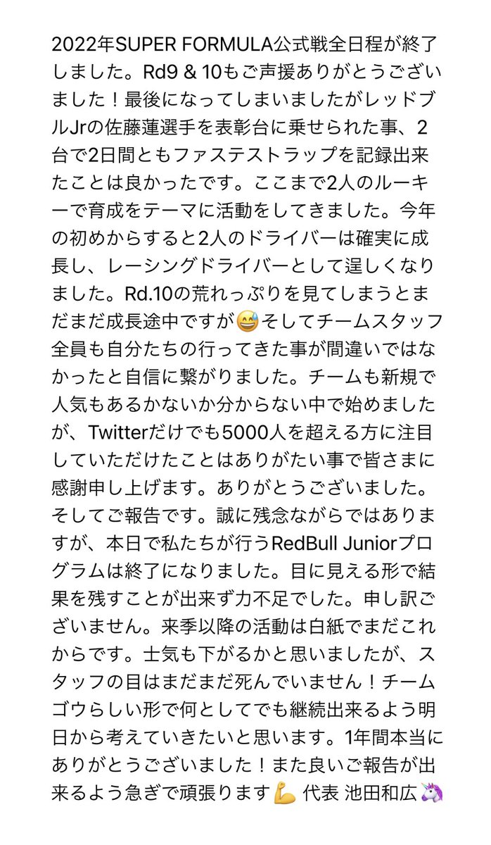 笹原選手サイドとは交渉しました。しかしお互いの条件や方向性が合意には至らずタイムアウト。お互いが対等な立場での交渉でしたのでどちらが強い弱いはないです。まだこれから笹原選手には信念に沿った素晴らしい道が開けると思いますので活躍を祈ります。そしてその時は私たちも負けないぞ💪池田🦄 twitter.com/MotorsportJP/s…
