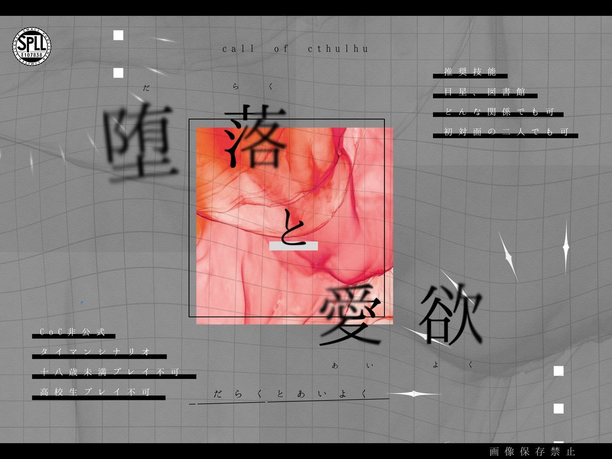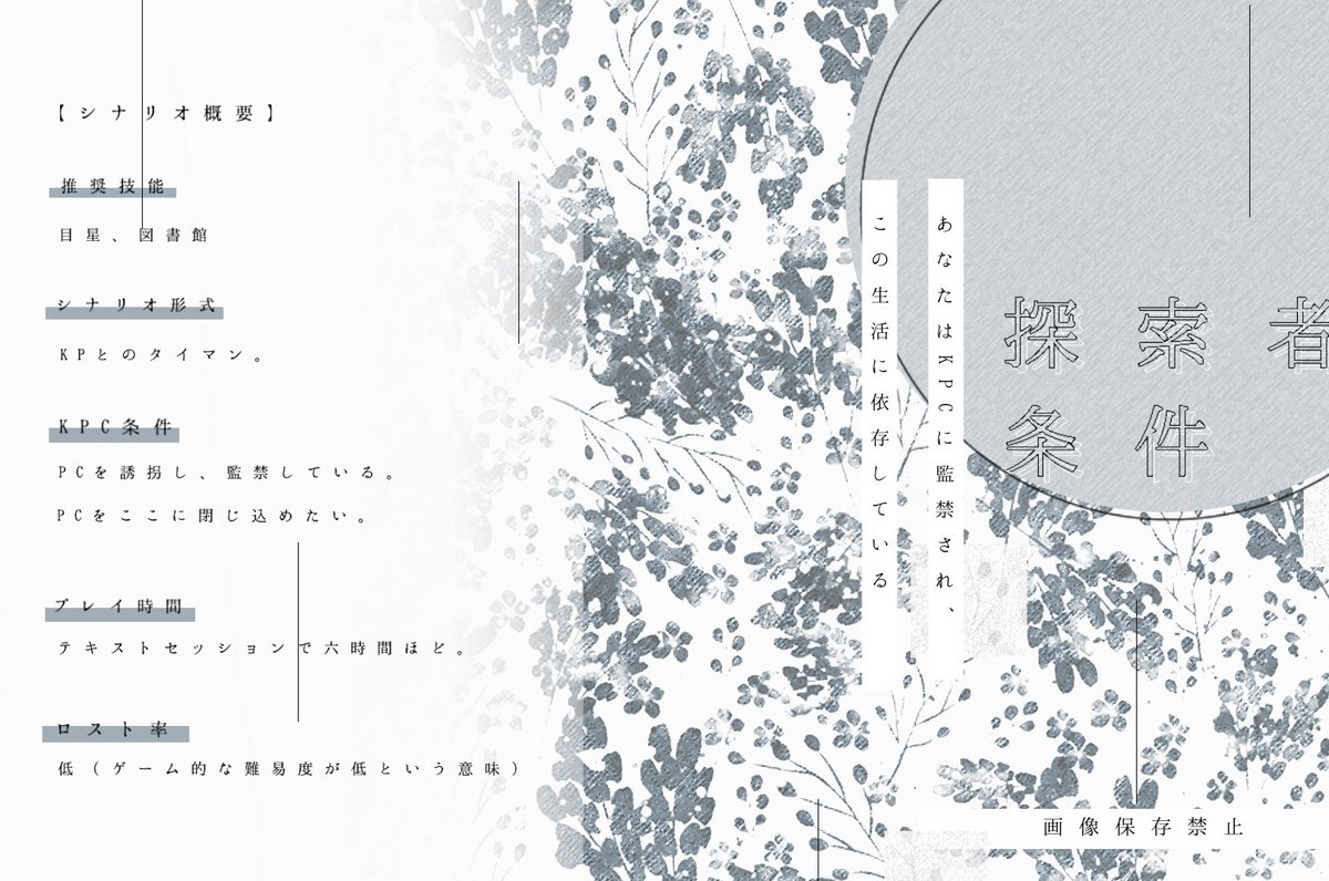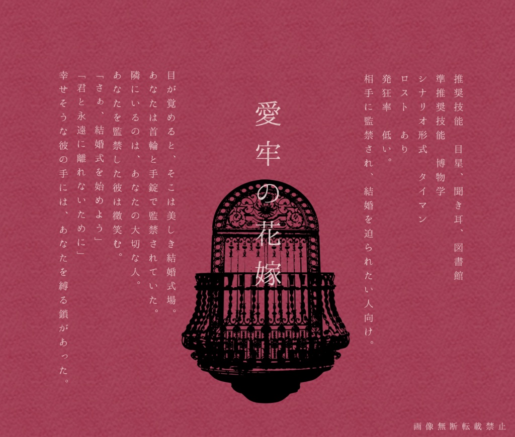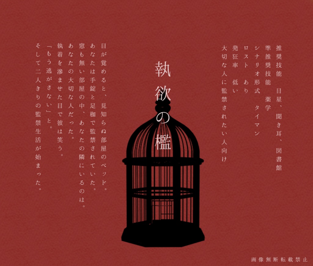 ヤンデレ×監禁テーマにしたCoCタイマンシナリオを三本収録したシナリオ集です。こちらのシナリオは全て六版対応です。