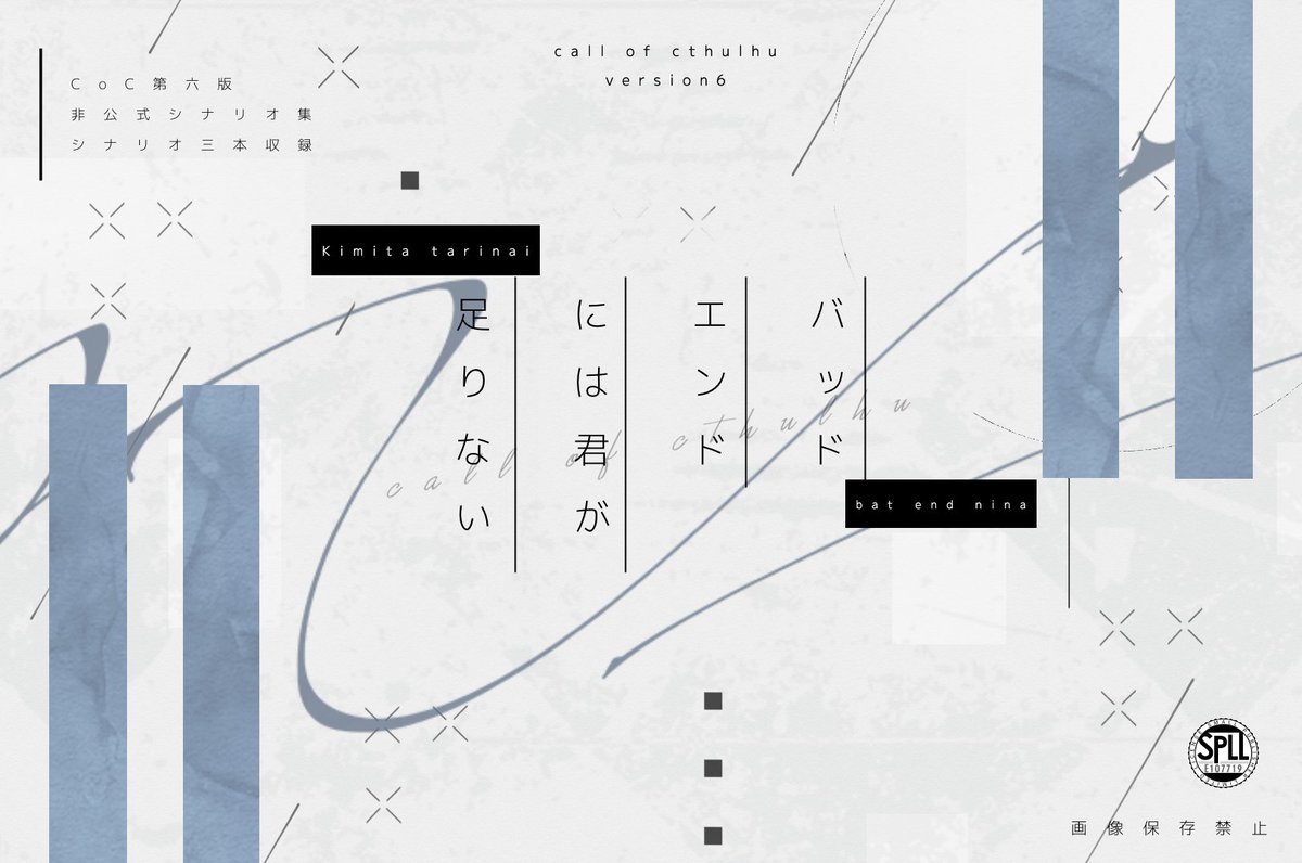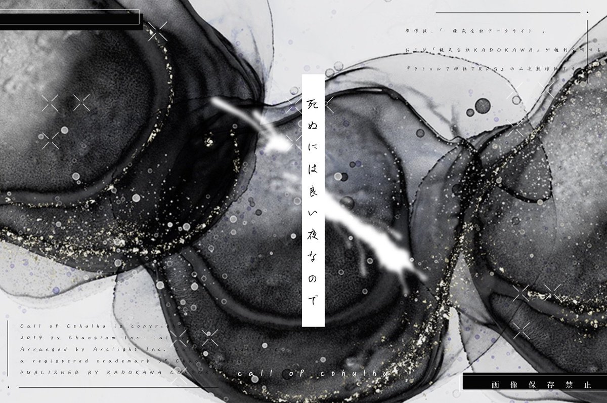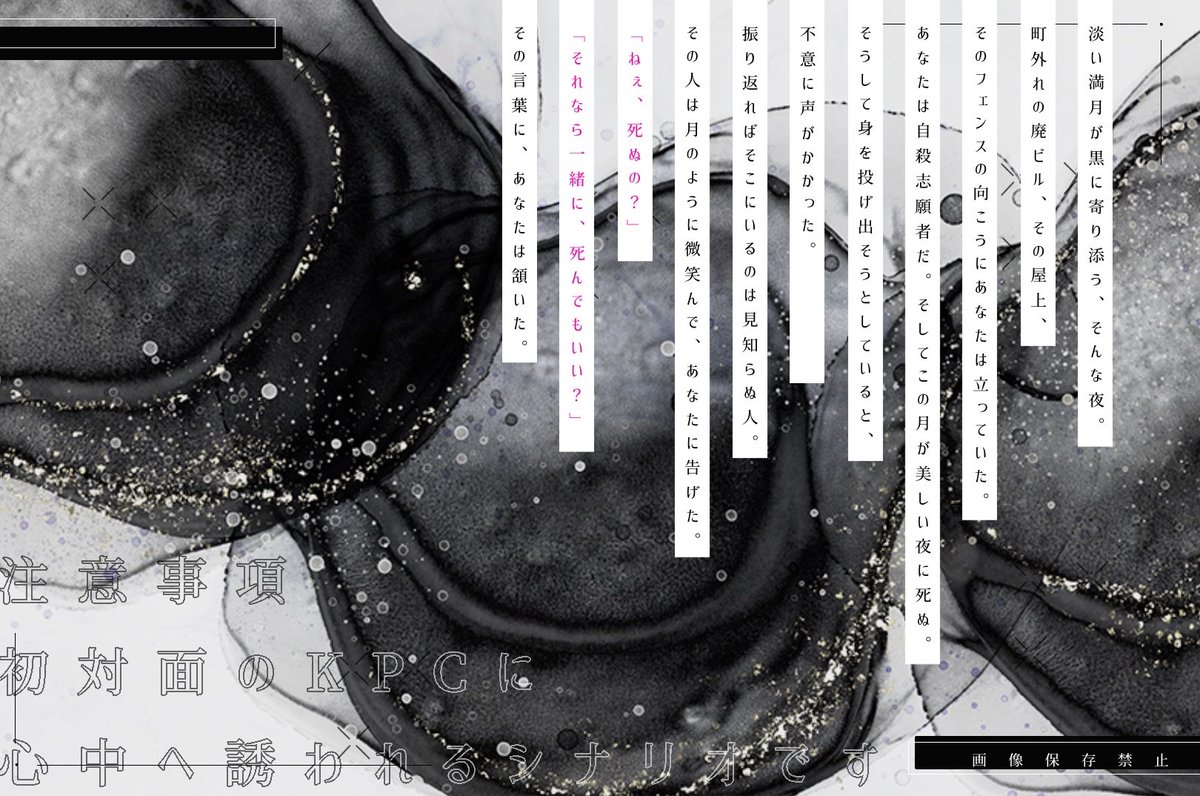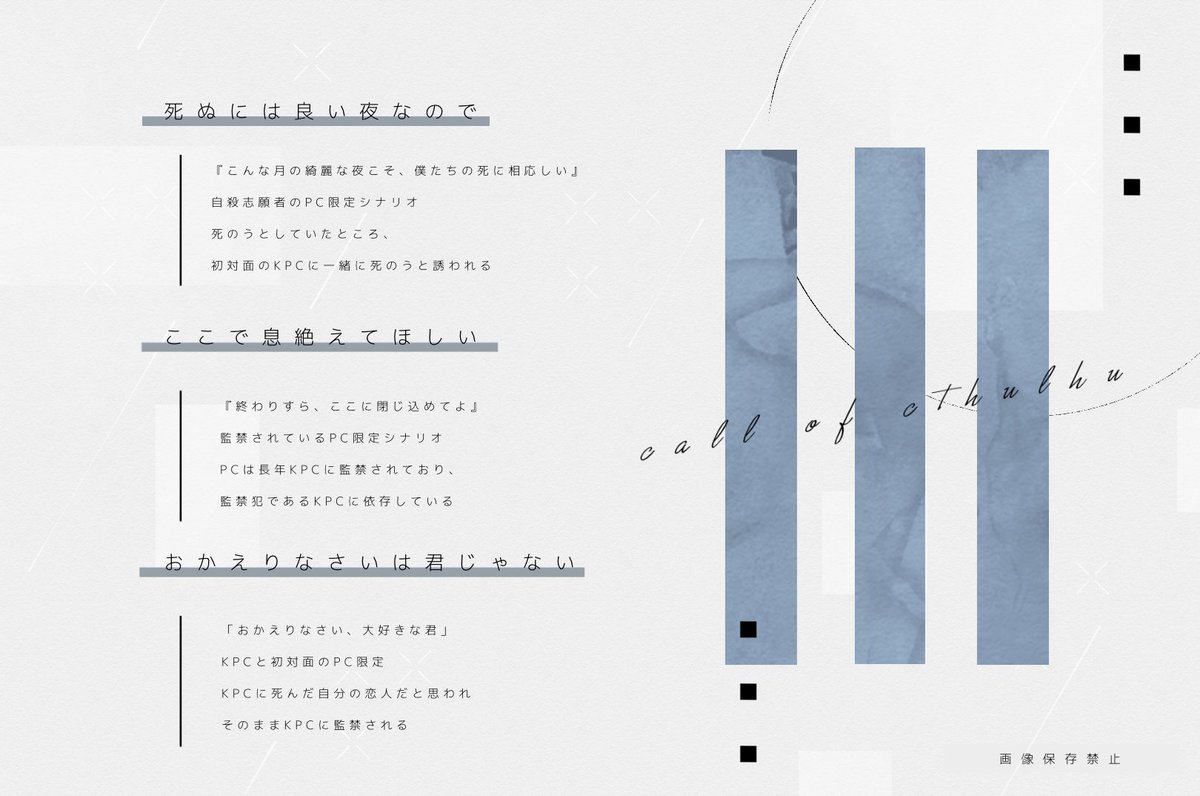自殺志願者PCがKPCに心中に誘われる『死ぬには良い夜なので』長年監禁され犯人KPCに依存するPCの『ここで息絶えてほしい』KPCに死んだ恋人だと思われ監禁される『おかえりなさいは君じゃない』の三本収録CoC非公式タイマンシナリオ集です。
