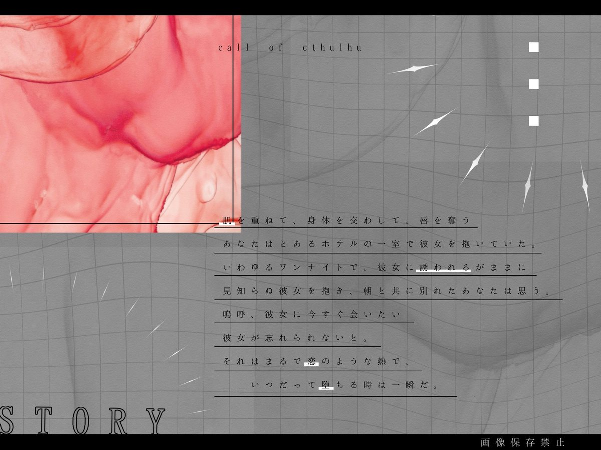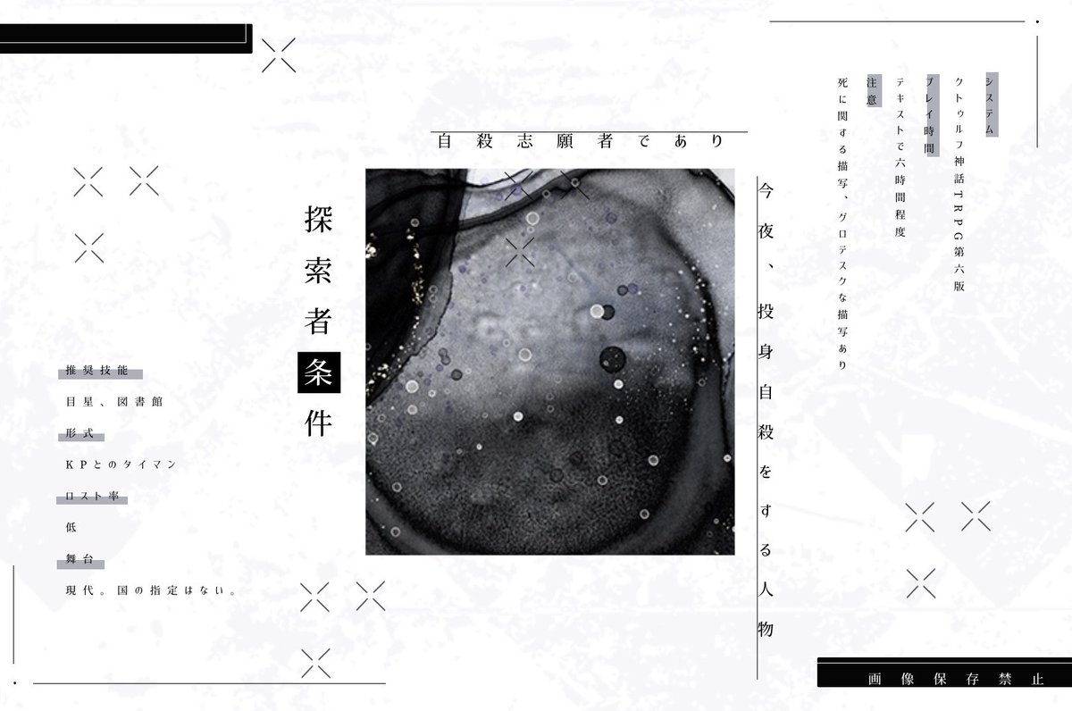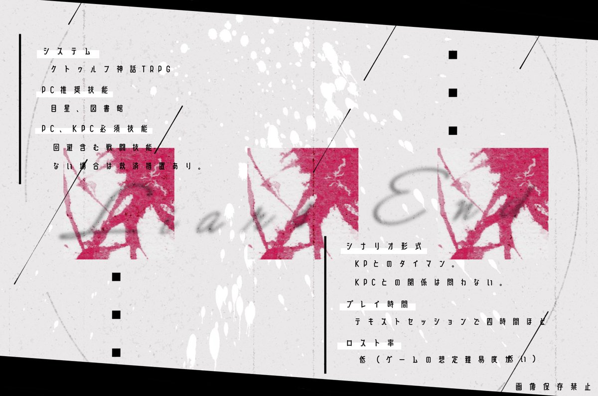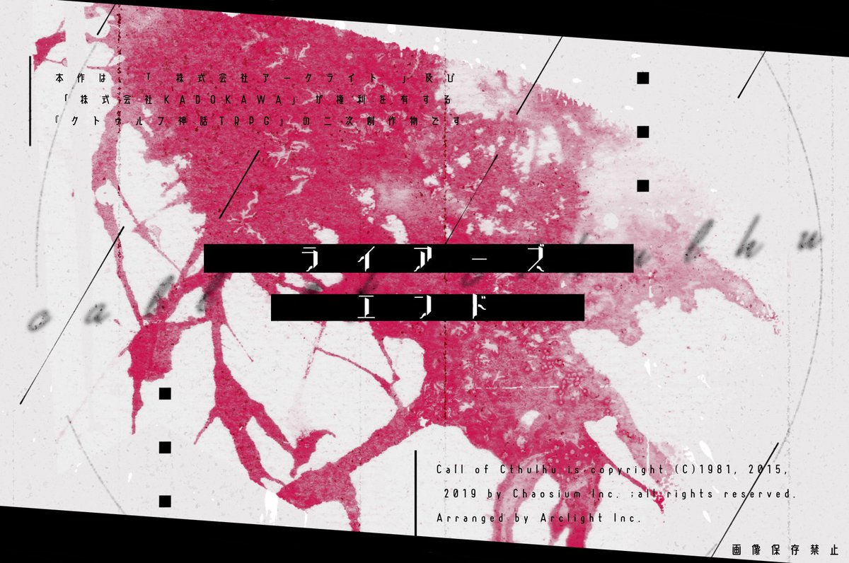 自殺志願者PCがKPCに心中に誘われる『死ぬには良い夜なので』長年監禁され犯人KPCに依存するPCの『ここで息絶えてほしい』KPCに死んだ恋人だと思われ監禁される『おかえりなさいは君じゃない』の三本収録CoC非公式タイマンシナリオ集です。