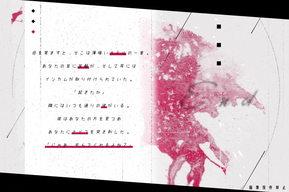 目が覚めたら見知らぬホテルにいて首輪とインカムをつけられ、KPCに殺されかけるCoC非公式タイマンシナリオです。関係性問わずKPCと殺し合いができます。