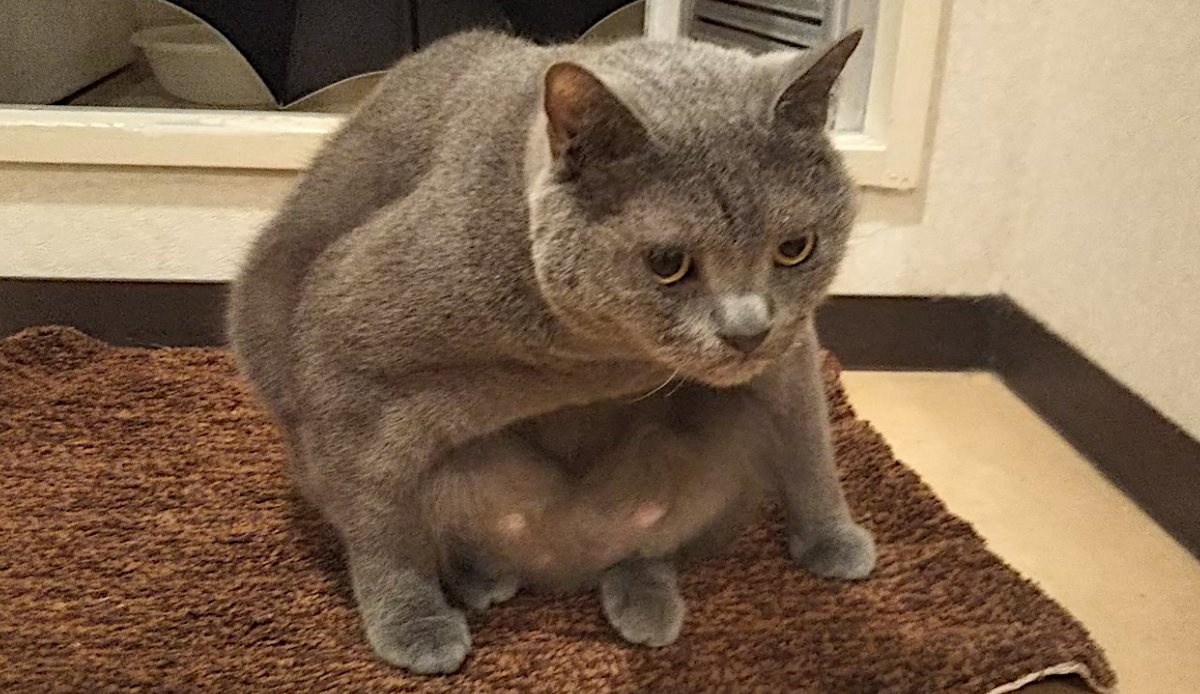 今度はバスマットの上で大真面目に変な座り方。じゅうたんに乗る乳出しアラジンか🧞♂️私は何を見せられているのだろう😅