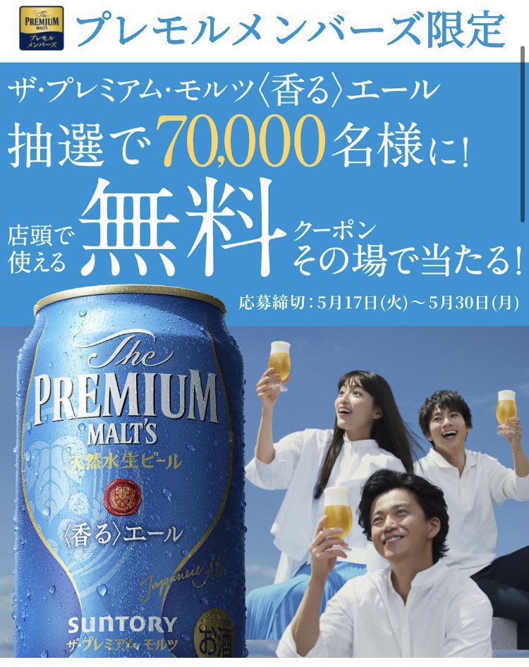 プレミアムモルツ 無料クーポンが7万人に当たります👏