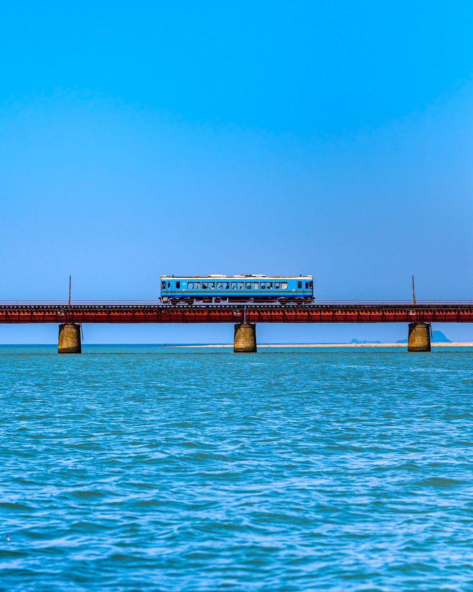 青い空と青い海に青い電車。