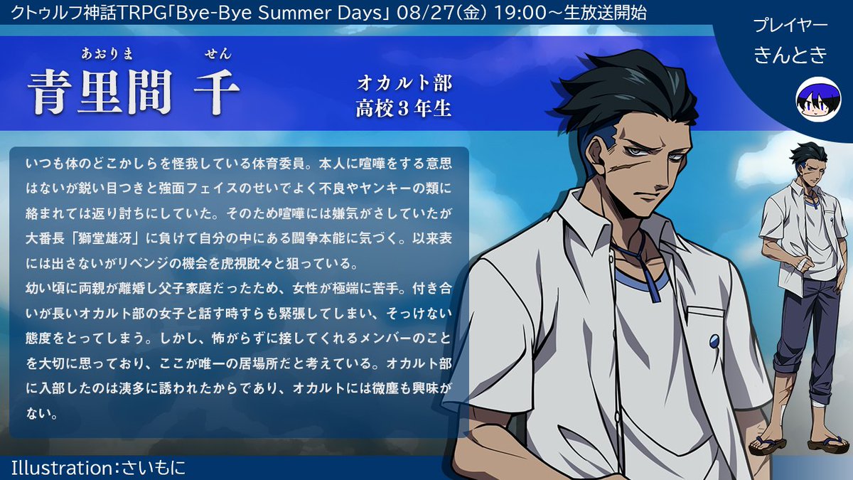 まずはきんときさん( @kintokiWT )演じる青里間 千(あおりま せん)です。