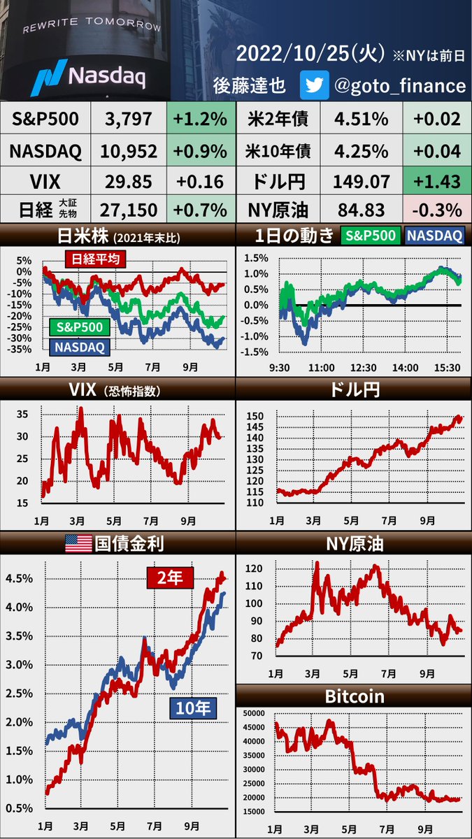 「FRBは11月FOMCで0.75%の利上げをし、12月以降に利上げ幅を縮めていくことをいかに織り込ませていくか議論する見通し」とWSJが報じています。執筆者のNick Timiraos氏はアメリカを代表するFRB担当記者。この報道で市場の利上げ警戒が少し和らいでいます wsj.com/articles/fed-s…