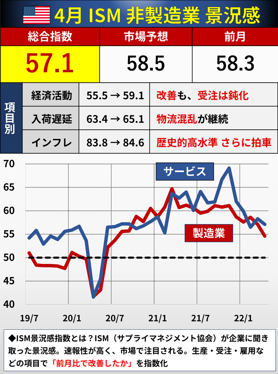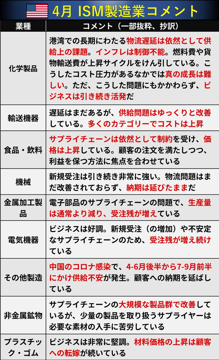 FOMC対応で昨晩は早めに休んだので、ISMのツイートが遅れました。下記の通り、全体は鈍化。物流停滞やインフレは悪化しています。企業のコメント集はあとで余裕があればツイートします