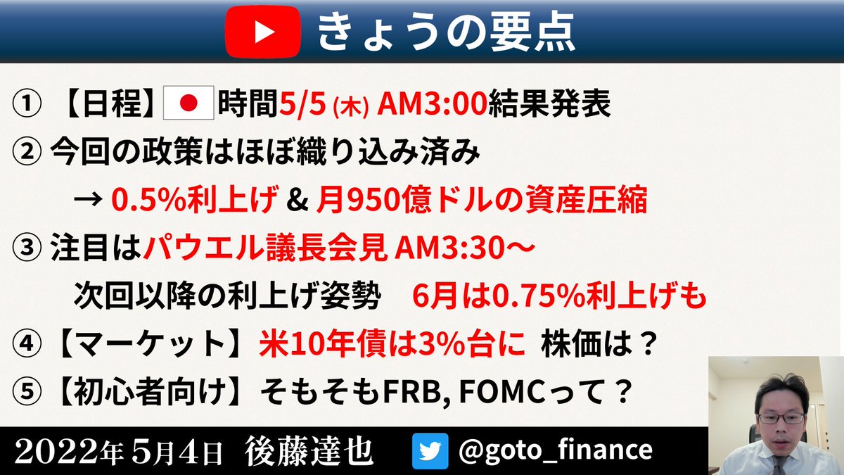 FOMCプレビューをさきほどYouTubeで流しました。要点は下記。最後のほうに「そもそもFRB, FOMCって?」というかみ砕いた基本解説も入れております。ほかにもいろいろ詰め込みました。GW中で恐縮ですが、休日の頭の整理にぜひご覧ください🙇♂️