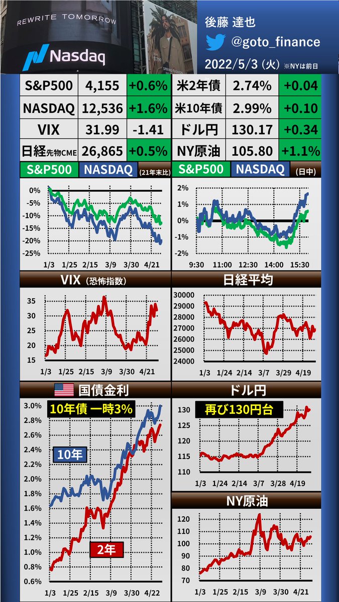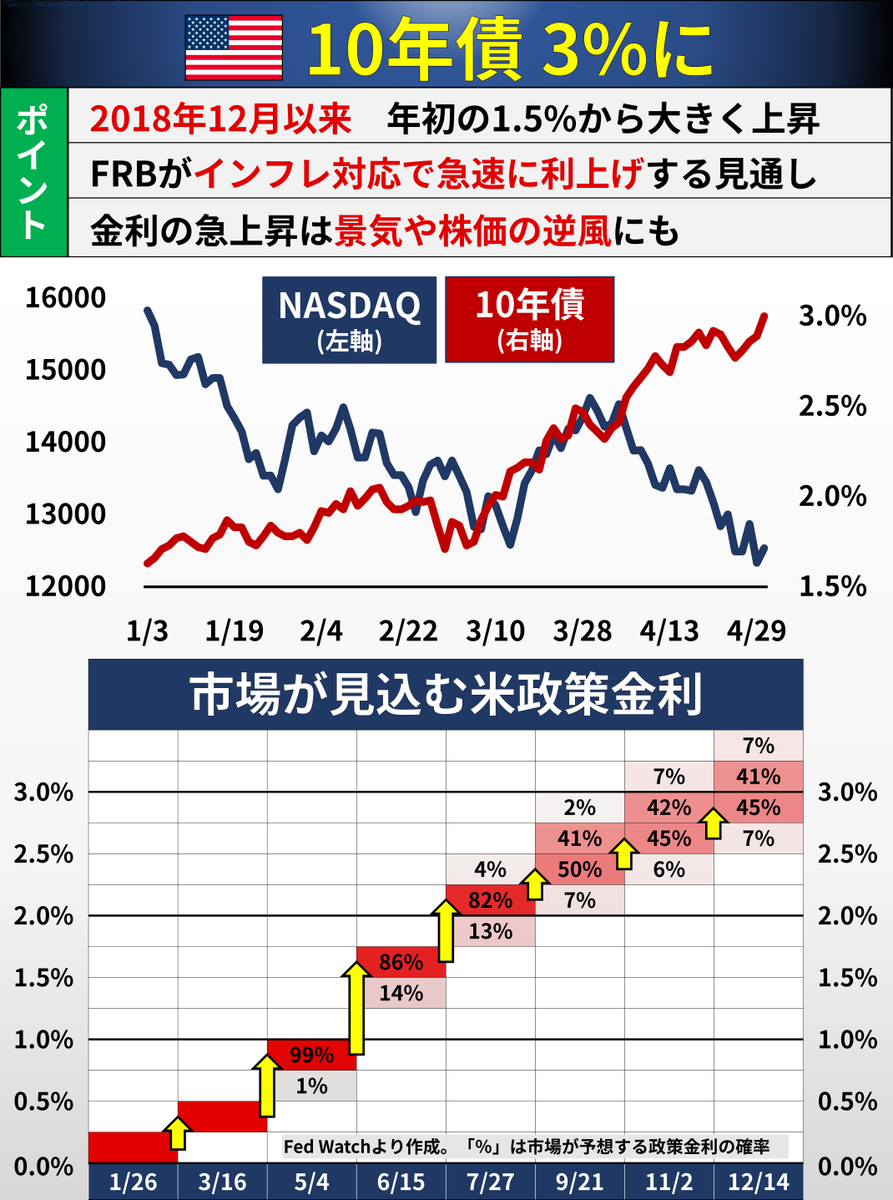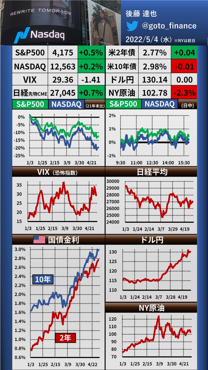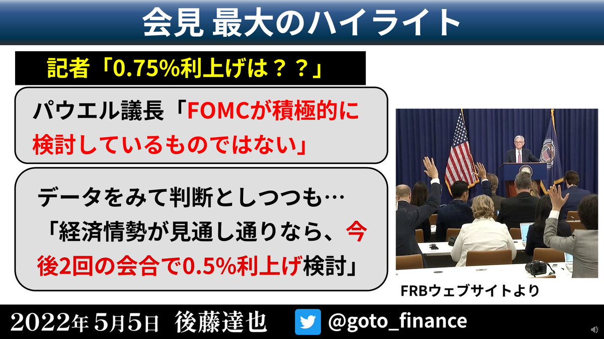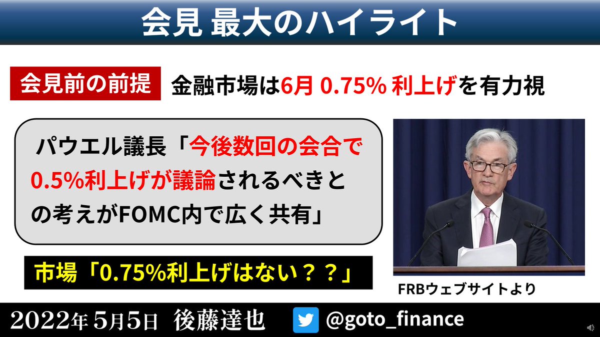 立て続けにツイートした「パウエルFRB議長会見の速報」を1枚のスライドにまとめました。6月の0.75%利上げに消極的な姿勢をみせ、2年債利回りが大きく低下。ナスダックなど株価は大きく上昇しました(右グラフ)#FOMC