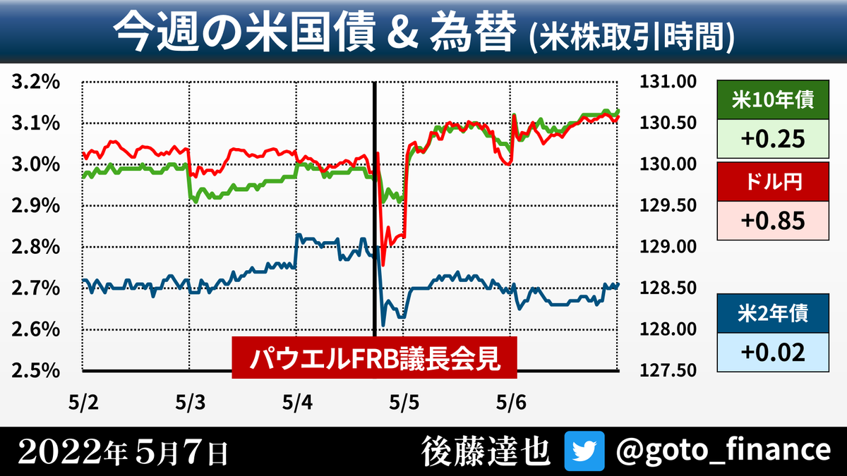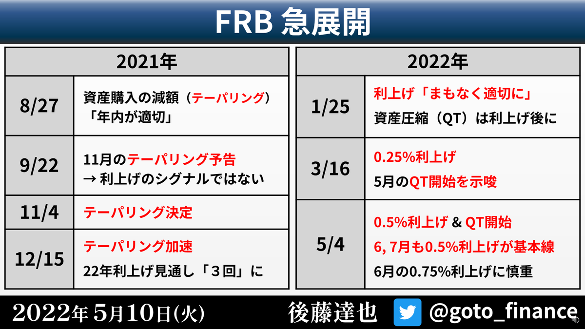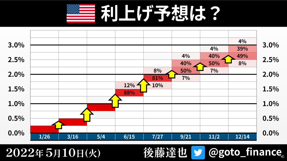 7:00までの配信を目指していましたが、少し遅れました🙇♂️ ですが、この時間にしては結構盛りだくさんでいい映像解説ができたと思っています。スライドの一部を下に貼っておきます。6-7月の0.75%利上げ予想もまた浮上しています