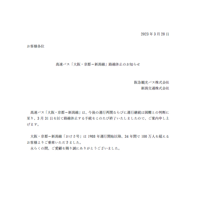 「おけさ号」も事実上の運行終了。 残念です。 (それにしても、老舗夜行路線の休廃止が続くなぁ・・・。) 『大阪・京都~新潟線の路線休止について』(阪急観光バス公式サイト)