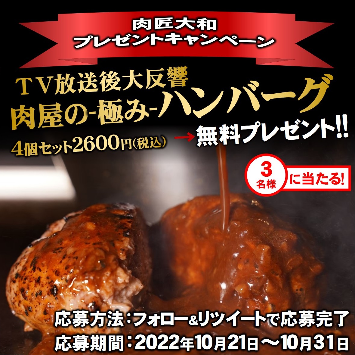 /  #プレゼント企画 第1段‼️ \ TV放送後大反響となった 肉屋の極みハンバーグ 4個セット2600円(税込)を #抽選 で3名様に #プレゼント 🎁 ◼️応募方法 ①アカウントをフォロー ②この投稿をリツイート ◼️応募期間 2022.10月21日~2022.10月31日まで ◼️当選発表 DMにてお知らせ #懸賞 #応募
