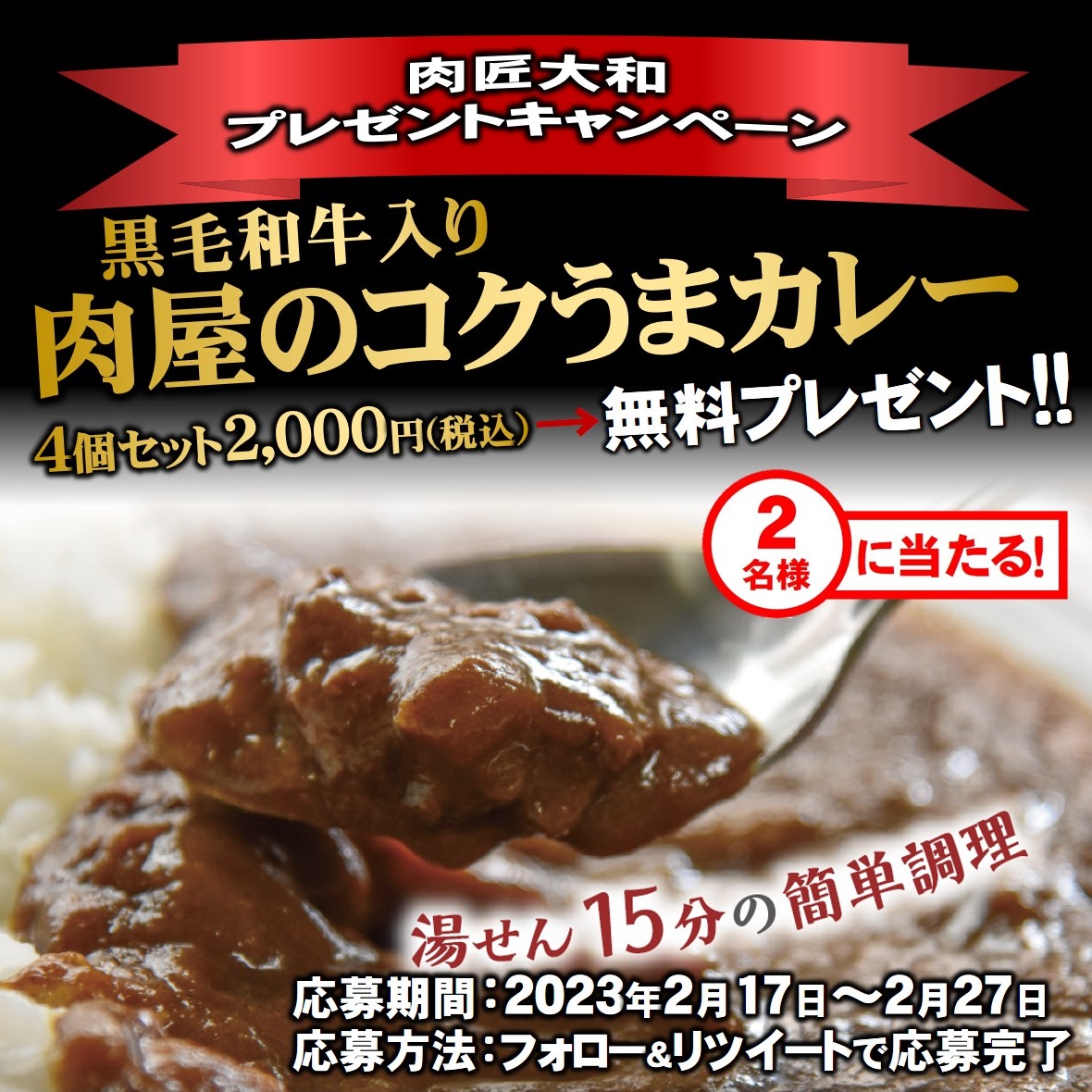 /  ㊗️大和フーズ設立10周年㊗️  #プレゼント企画   \  黒毛和牛入り肉屋のコクうまカレー4個セット2000円(税込)を #抽選 で2名様にプレゼント🎁✨ ◼️応募方法 ①アカウントをフォロー ②この投稿をリツイート ◼️応募期間 2023.2/17~2023.2/27まで ◼️当選発表 DMにてお知らせ #懸賞 #応募