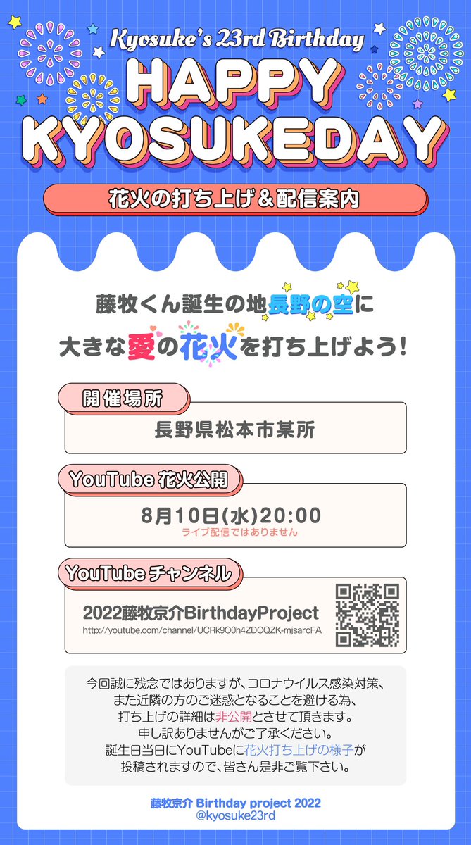 先程20時に花火打ち上げがYouTubeチャンネルにて配信されました。