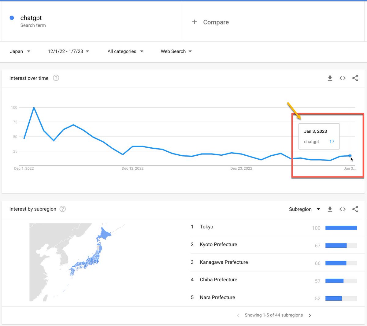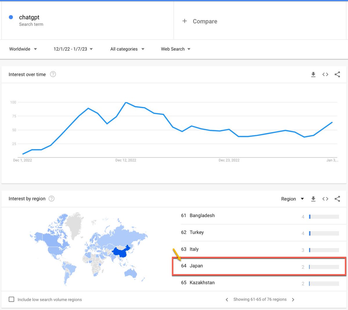 ChatGPTの使い道を思いつけてない、思いつける人が少ないのも日本で普及が進まない理由だと思う。世界でChatGPTに対する関心度が64%に対し日本では17%しかない。順位で見ると64位。同じアジア圏でも台湾や韓国がそれぞれ30位と33位になってるのを考えると日本での関心がどれくらい低いのかがわかる。 twitter.com/mhiro216/statu…