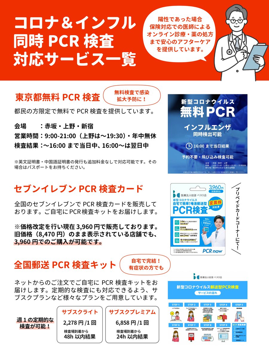 東京都無料化検査、セブンイレブン検査キット、全国郵送検査キットにてインフルとコロナ同時PCR検査実施中です!