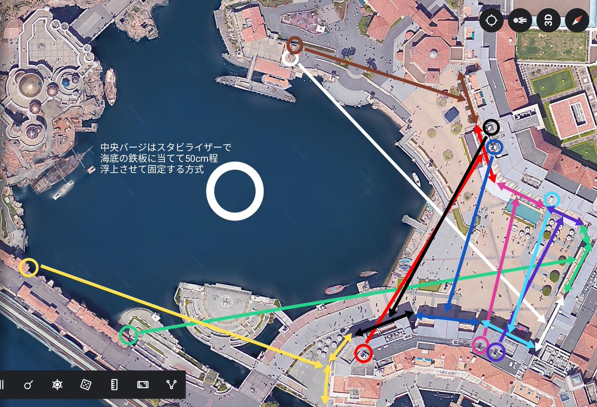 ビリーヴで使われる主な光学機材の配置及び投影エリアマップ ・プロジェクター ミラコスタ屋上に6カ所 ポンテベッキオの出窓に2カ所 スチーマー出口2階に2カ所 ・プロメテウス火山用レーザー投影プロジェクション 旧抽選場屋上 ・メインサーチライト 黒い四角6カ所