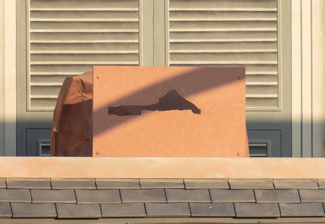 ミラコスタの旧抽選場の屋上にあるBelieve!のプロメテウス火山用レーザープロジェクション装置2台。 プロメテウス火山以外の方向にレーザーが照射されないように、ちゃんと装置にプロメテウス火山の形をかたどったフィルターが装着されてる。