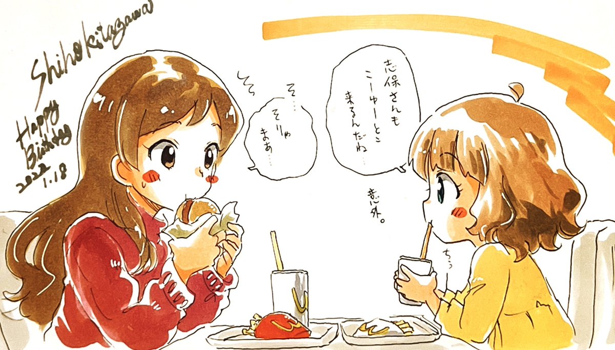 ファストフードで食事するセンパイ。と志保さん。 いつも忙しそうなのでセンパイ的にあまり寄り道してるイメージが無い志保さん。 志保ちゃんお誕生日って事で。