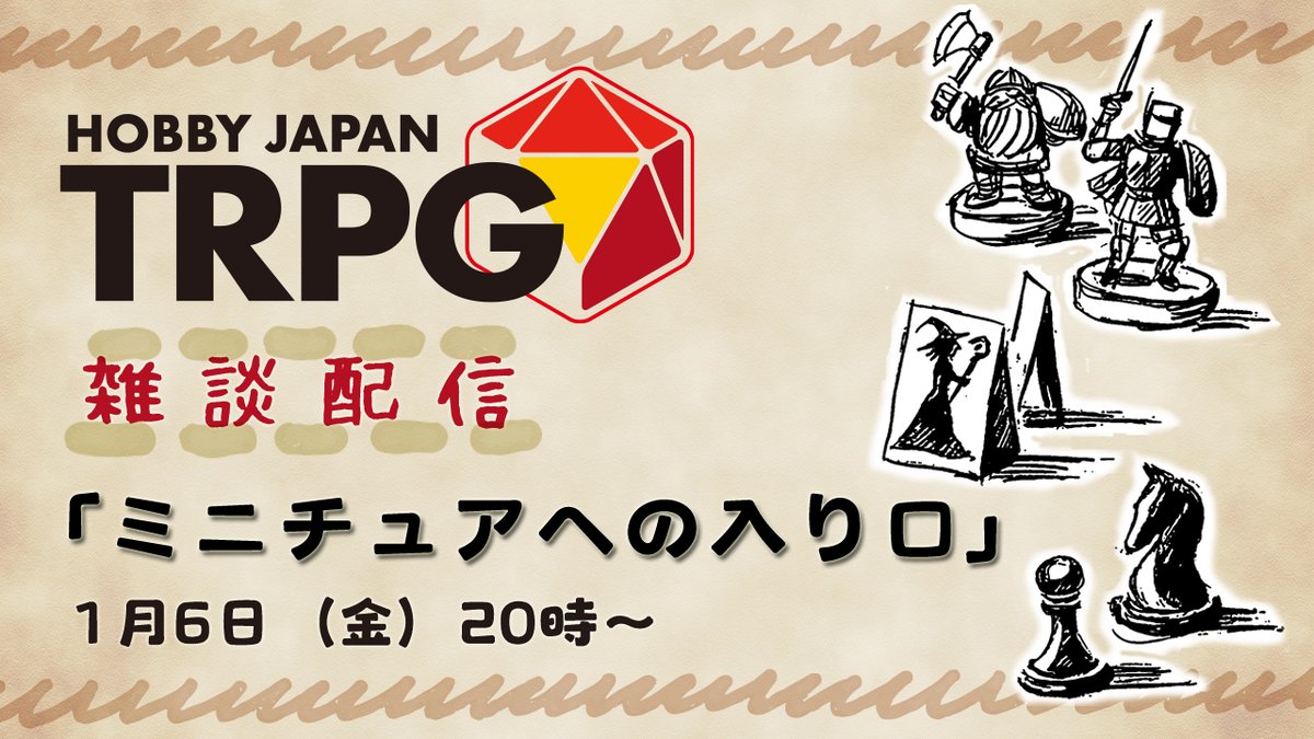1月6日(金)20時より、TwitchのホビージャパンTRPGチャンネルにて30分ほど、「ミニチュアへの入り口」というテーマで、傭兵ペンギンさんをお招きしてゆるっとしゃべって行こうかと思います。よろしければぜひご覧ください。