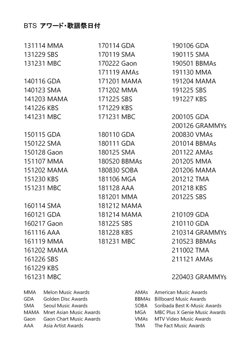 アワードと歌謡祭の日付をまとめました。