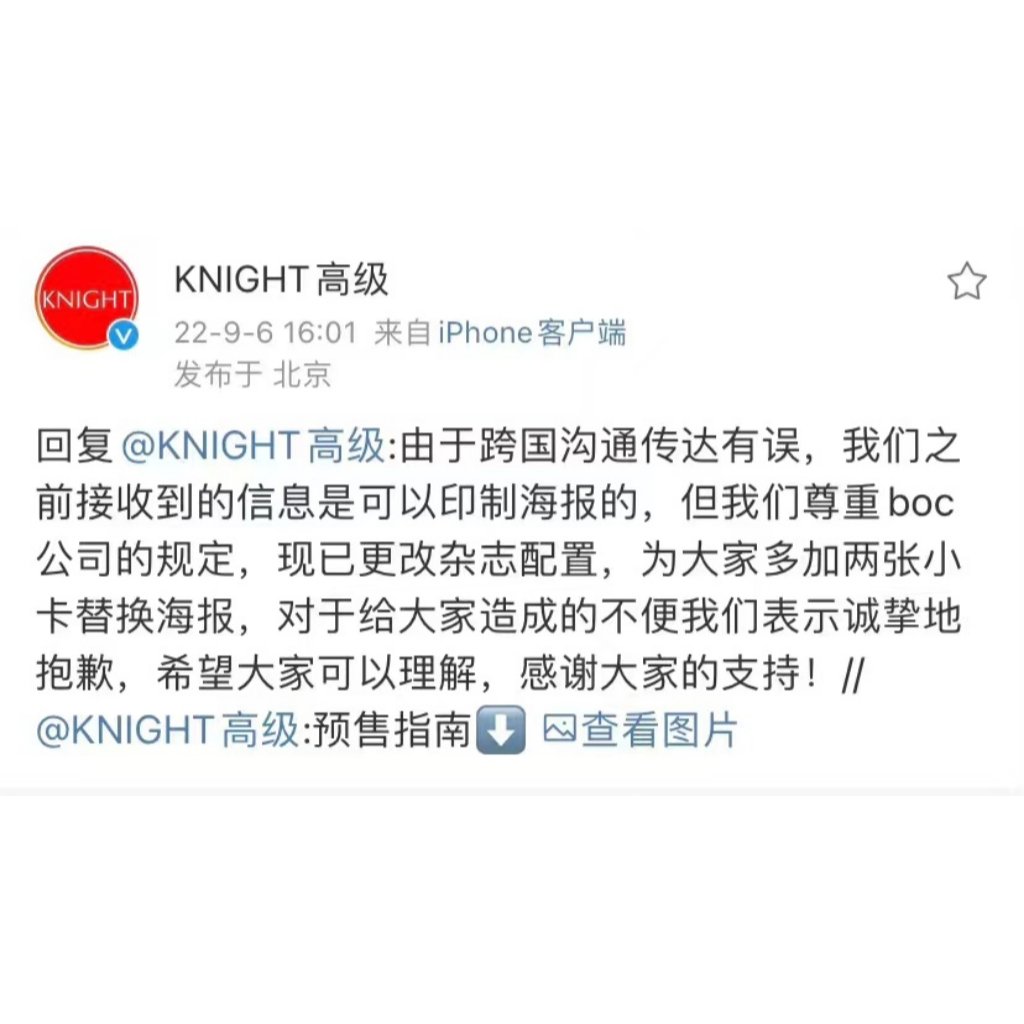 Knight Magazine Weibo Update: Due to the mistake happened during international communication, we has now changed the two posters to two new photocard with sincere respect to BOC regulation. Thank you for your support and understanding. twitter.com/JeffBarcode_CN…