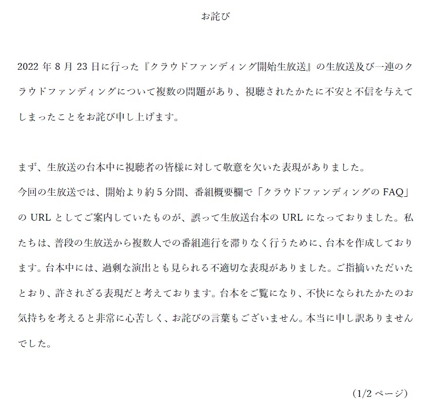 『クラウドファンディング開始生放送』の生放送及びクラウドファンディングについて視聴されたかたに不安と不信を与えてしまったことをお詫び申し上げます。