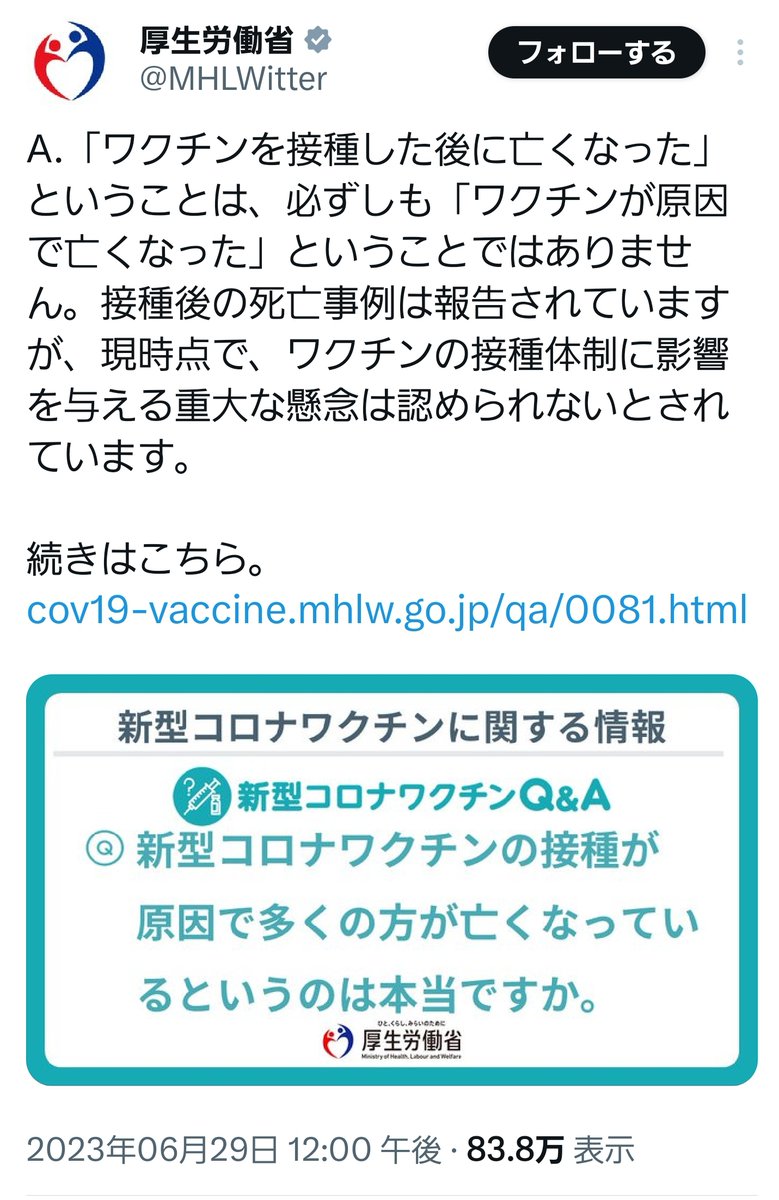 厚労省「ワクチンを接種した後に亡くなった」は必ずしも「ワクチンが原因で亡くなった」ではないと投稿(デイリースポーツ)