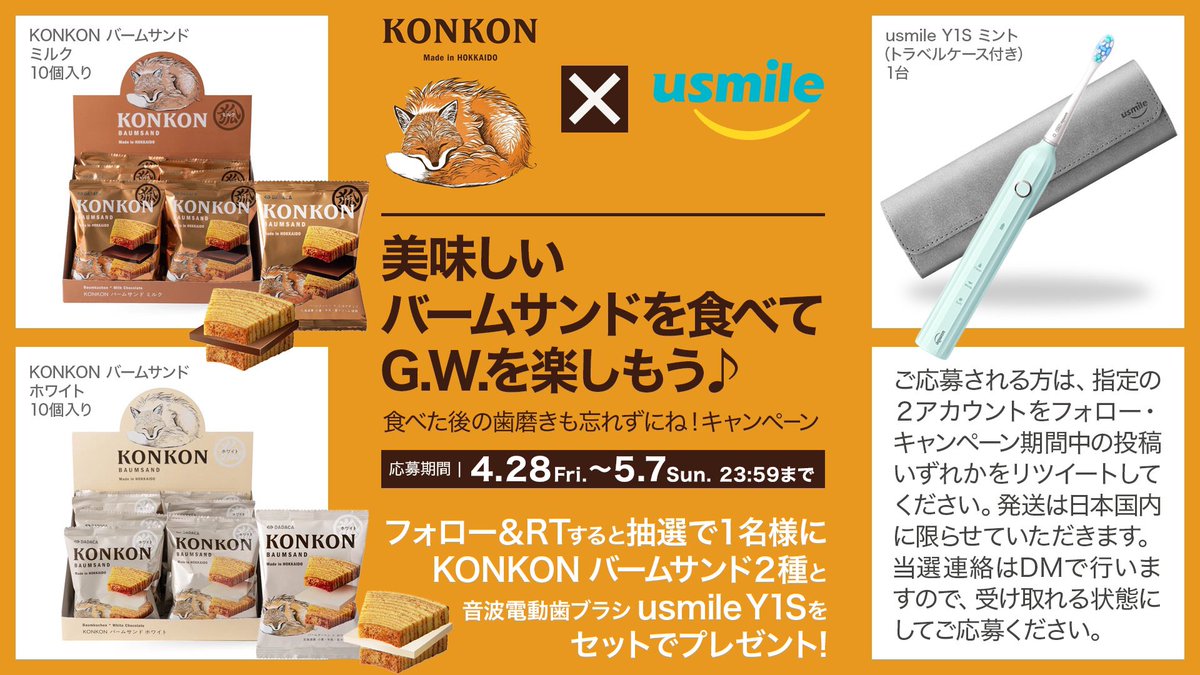 『usmile Y1S ミント1台』と『KONKONバームサンド ミルク・ホワイト 各10個(計20個)』を1名様へ #プレゼント🎁