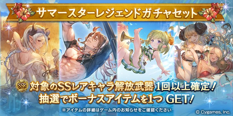 【グランブルーファンタジー】7/31(土) 12:00より「サマースターレジェンドガチャセット」を開催しました。Sレア以上1回確定10連ガチャ・対象の水着バージョンSSレアキャラ解放武器確定ガチャ・ボーナスアイテム1種類のセットをご利用できます! #グラブル