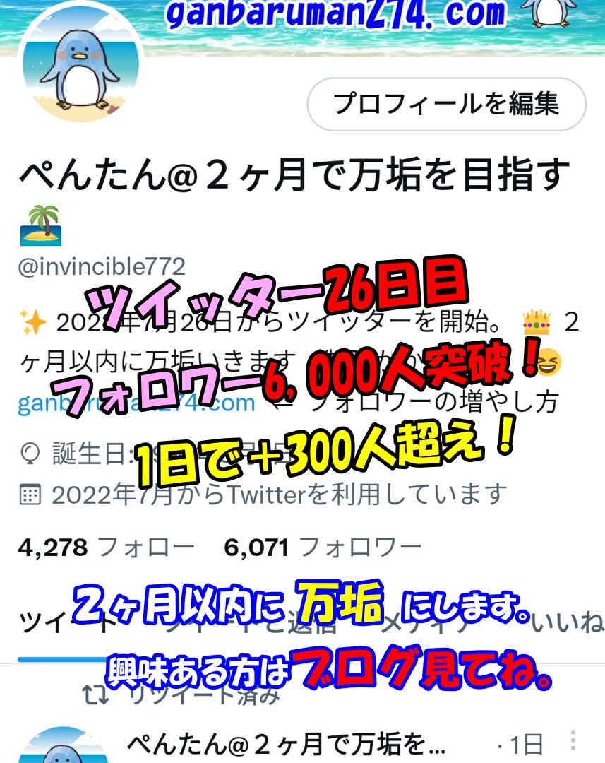 ツイッター始めて26日でフォロワーが6,000人超えました。