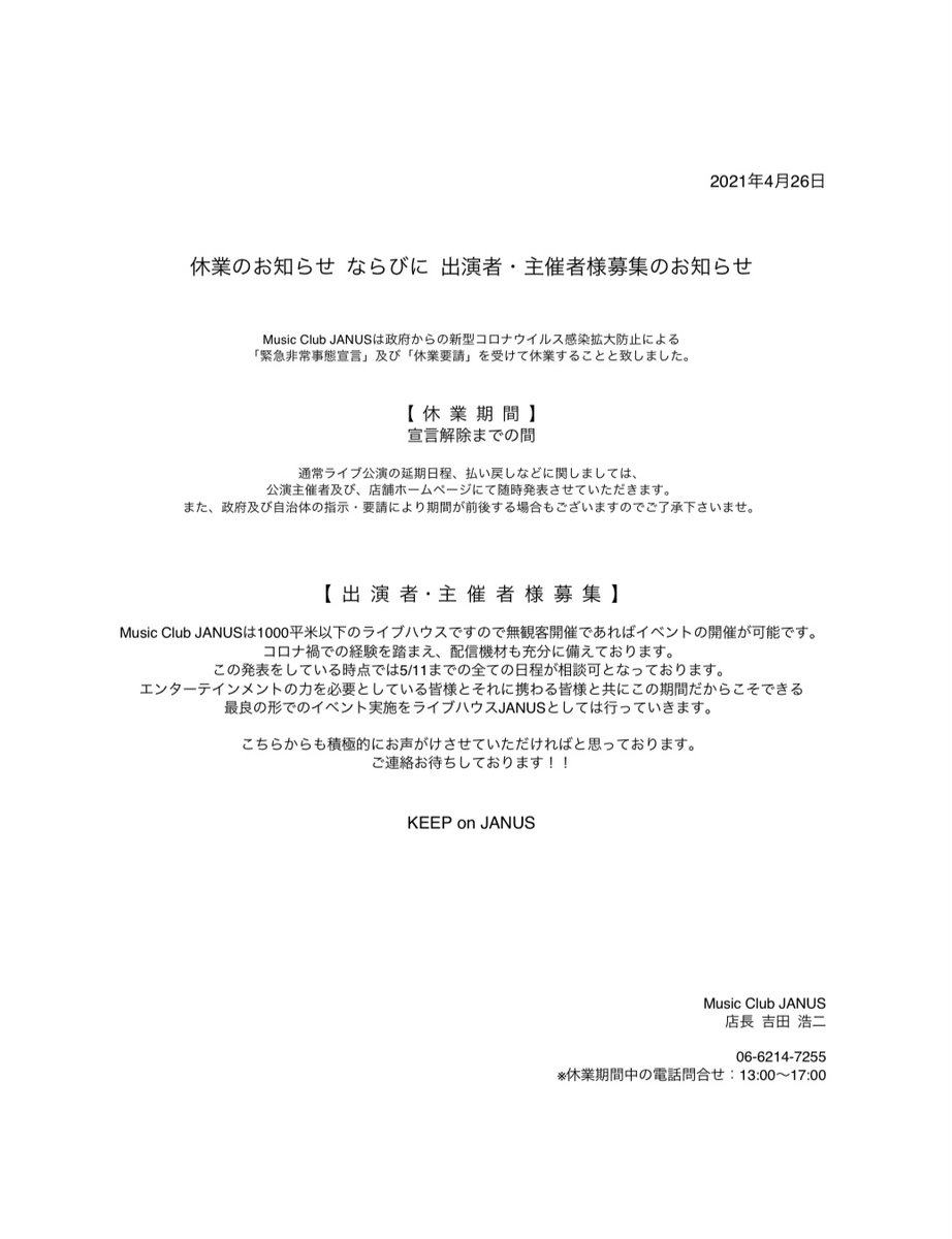 5/11まで休業致します。が、ただじゃ転ばないのがライブハウス。期間中に無観客でのイベントを開催したい!という方がいらっしゃいましたら是非ジャニスに電話をいただければと思います。エンターテイメントは必要不可欠。ライブハウスもまた。店長コ&スタッフ一同 #拡散希望