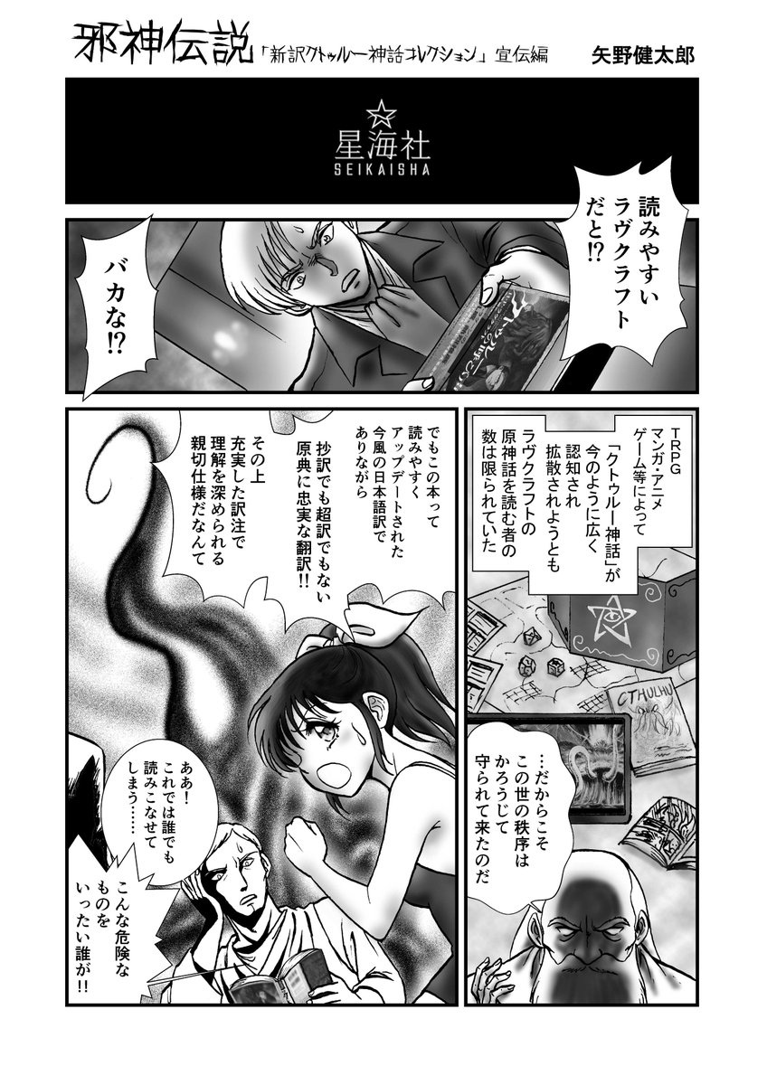 @Molice さらに、SAKAE&するばさん(@2saKae5)に感想マンガ「『クトゥルーの呼び声』を読んでみた。」をお描きいただきました! とても読みやすく、訳注・年表・索引・訳者解説を備えた親切設計の1冊です。クトゥルー神話入門のために、ぜひお求めください! amzn.asia/0Rwz6Sp