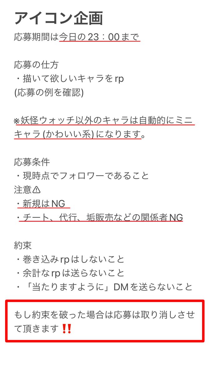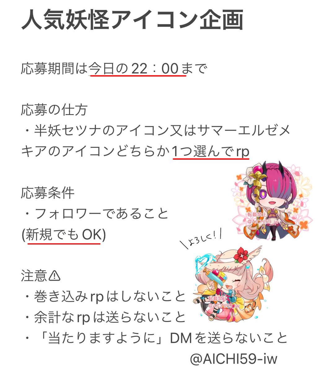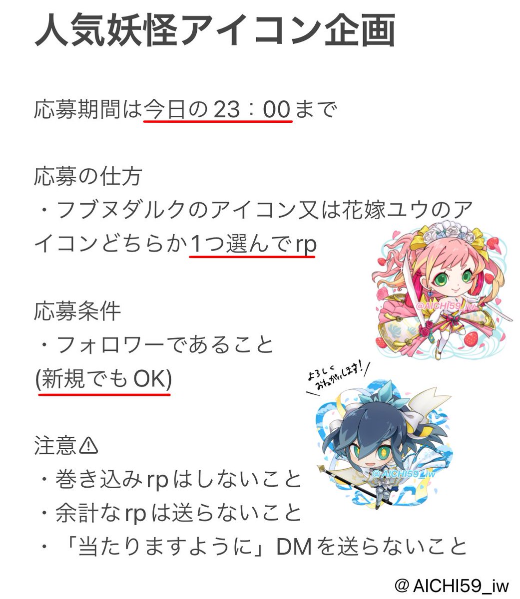 アイコン企画やります! 応募期間10日の20:00まで (予定より早く切り上げる場合があります) 応募の仕方 ・描いて欲しい妖ウォキャラ又はモンストキャラをrp (応募の例を参考に🙏) 応募対象は今の時点でフォロワーであることです。 今からフォロワーになられた方は今回は対象外です。