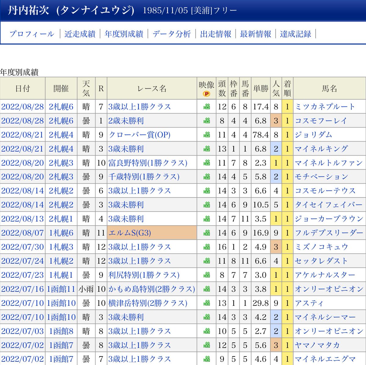 1着→3着→1着→1着→1着→2着→1着→1着→1着→14着→1着