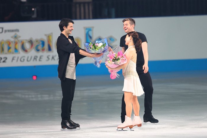 フィナーレ:佐藤有香さんに花束を手渡すステファン・ランビエルとジェフリー・バトル