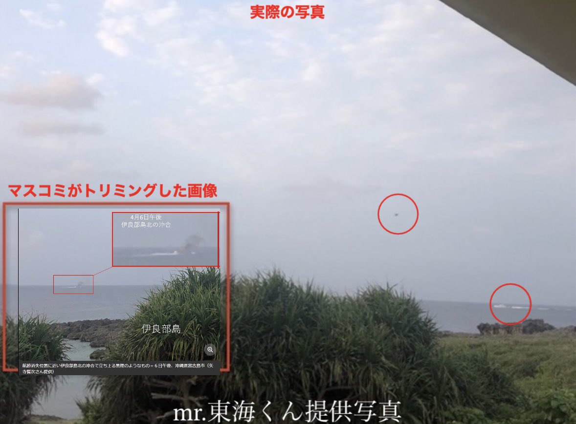 矢寺賢次さん提供とある黒煙があがる陸上自衛隊ヘリ墜落後の実際の写真には、自衛隊であろう別のヘリと船が写っているようだ。なんで隠すんだろうか。 twitter.com/kinoshitayakuh…