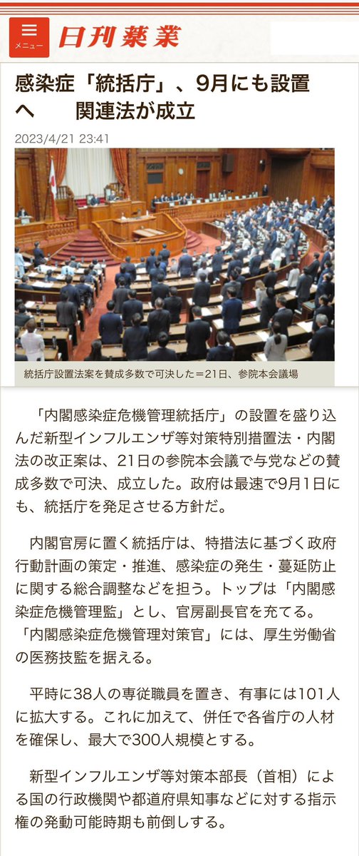 【全文】感染症「統括庁」、9月にも設置へ 関連法が成立(日刊薬業)