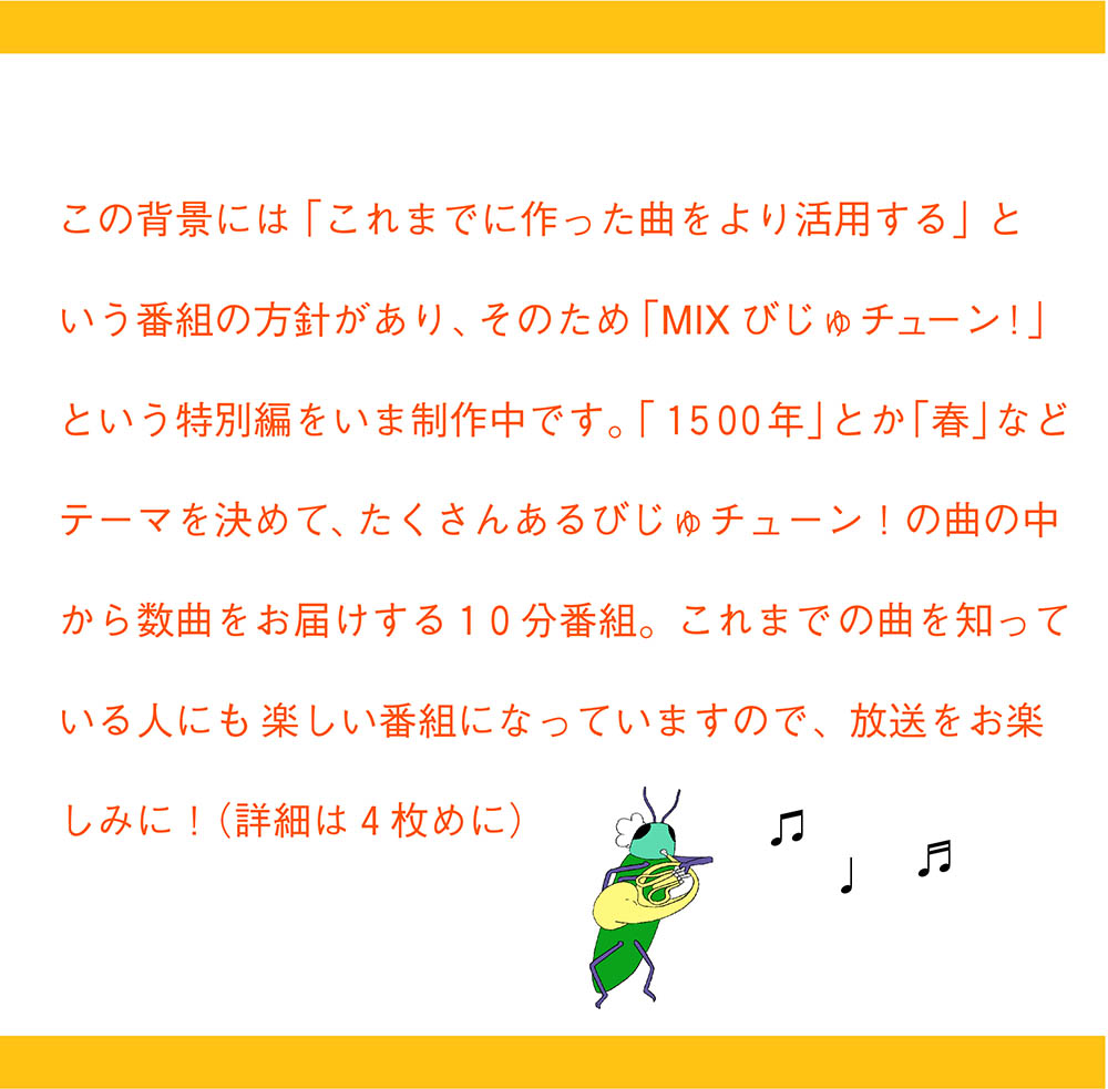おはようございます。1月に放送された「びじゅチューン!祝100曲スペシャル」が10月17日(日)午後4時から再放送。視聴者からのリクエストで作られた楽曲ランキングを、番組ファンだと公言されていたナイツ土屋さんと見ていきます。