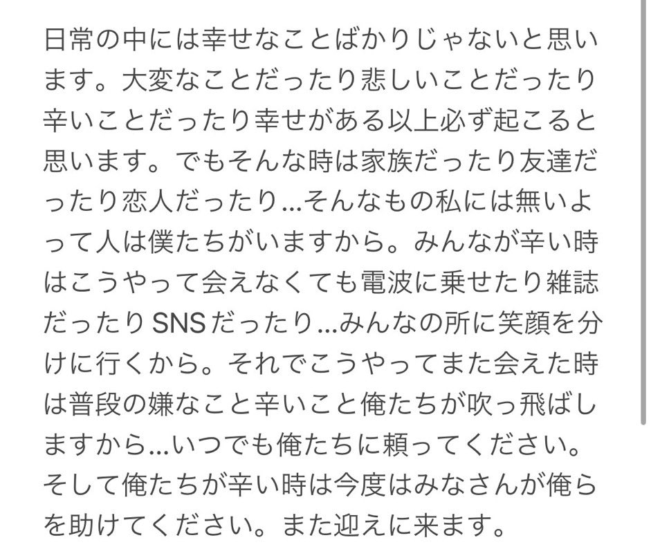 なんかこの数日しあわせの極みすぎるけどこの先これが普通になっても絶対しあわせ慣れしないようにしよ。2人が見れてることって当たり前じゃないしまた応援できてることが奇跡だし特大のありがとうはずっと忘れずにいる。