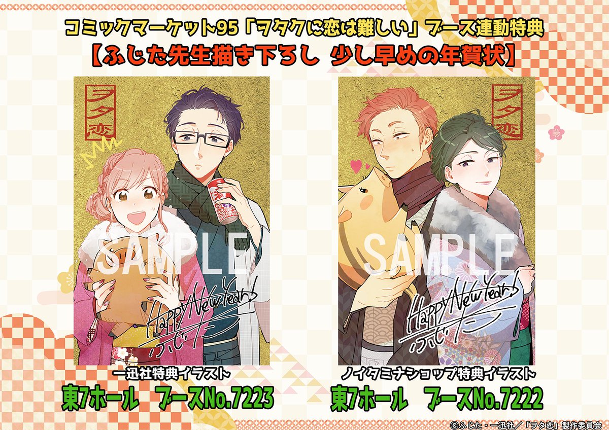 コミックマーケット95会場内の一迅社ブース(No.7223)、ノイタミナショップブース(No.7222)さんで『ヲタクに恋は難しい』関連商品をお買い上げの方に【ふじた先生描きおろし 少し早めの年賀状】をプレゼント!