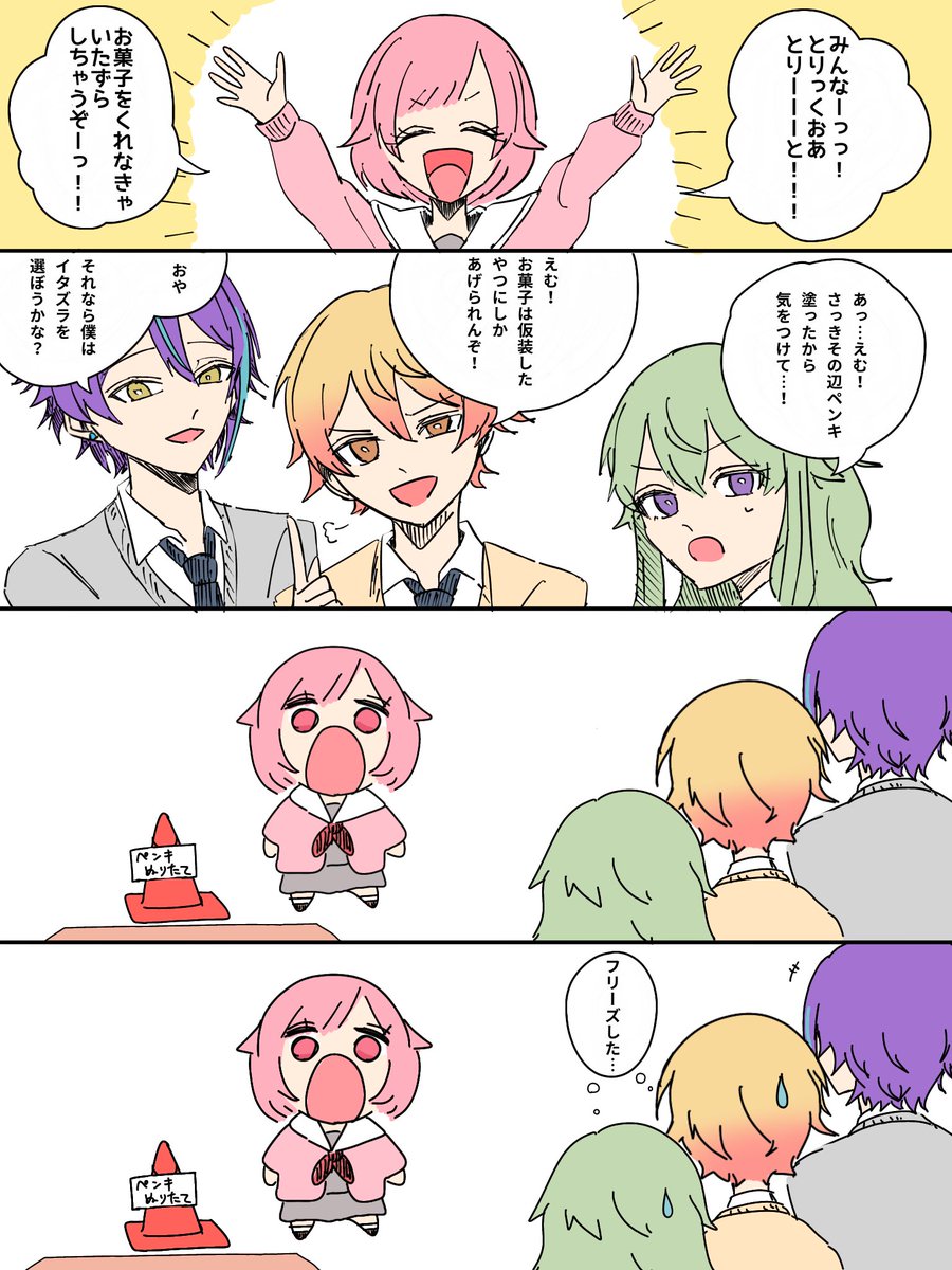 全てが雑なハロウィン漫画です🎃 えむちゃんは口元にさしだされたもの全部反射でたべそうだよね🍬