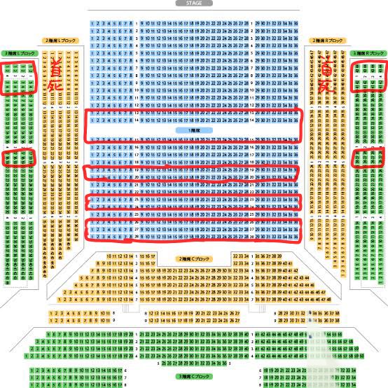 今年の夏にやったエーステでの立川ステージガーデンの見切れ席大体こう LRブロックは大体見えないとこあるけど特にダメな席を… (私が観劇した分と他の方の感想、公式から出てる情報的に) 1階席の赤囲いはもう半分近く見えんのでダメ ※テニミュが全フラットの場合、1階席の半分は見切れ席