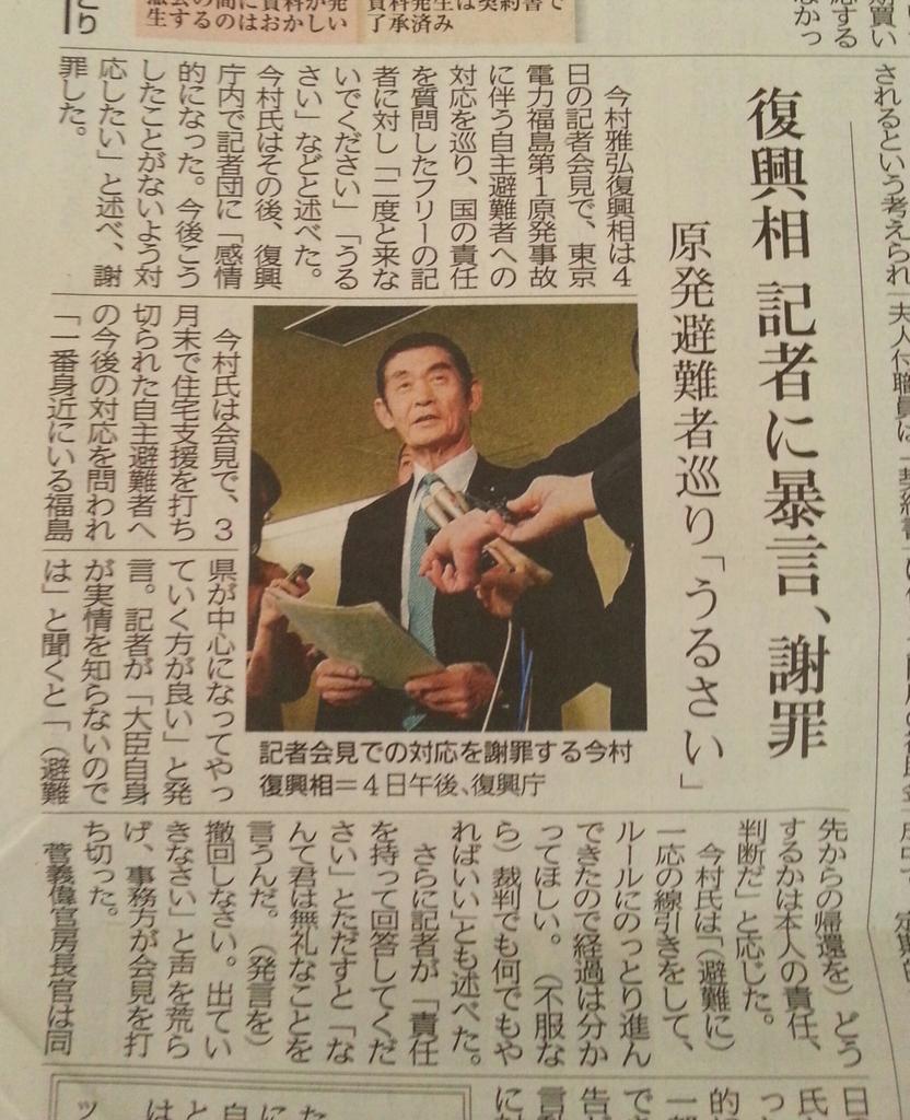 「不服なら裁判でも何でもやればいい」。今村復興相から本音を引き出したフリーの記者に拍手。会見の席でひたすらパソコンに向かっている記者からは、こんな核心をついた質問は出てこないかも。誰の横に立って取材しているかの違いか。