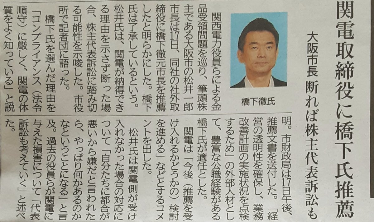 関西電力の筆頭株主である大阪市の松井市長が17日、関電の社外取締役に橋下徹元市長を推薦した。橋下氏も了承しているという。共同通信の配信記事によると、「松井氏は、関電が納得できる理由を示さず断った場合、株主代表訴訟に踏み切る可能性を示唆した」という。松井維新の脅し、まるで総会屋。