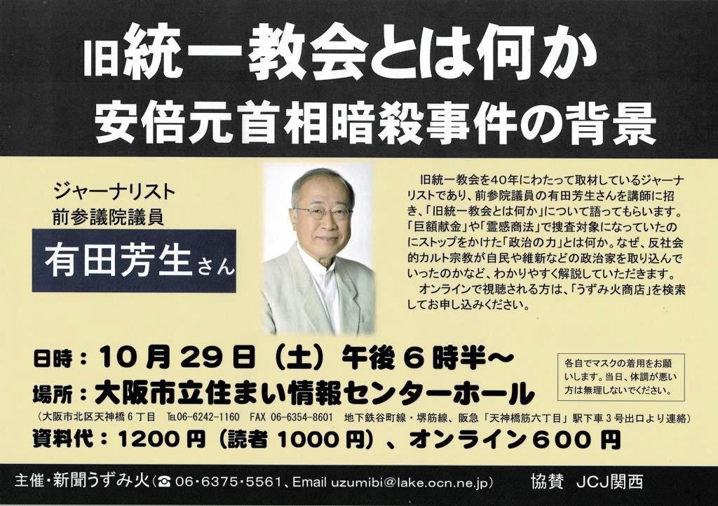 有田芳生さんの講演会は今週末、29日の土曜日です。 「関心があるので参加します」「政治家と旧統一教会の関係を知りたい」などの声に交じって、「テレビによく出ている人でしょう。行きたいです」という方もいらっしゃいます。何でもいいです、ぜひお越しください。 オンラインでも視聴できますよ。