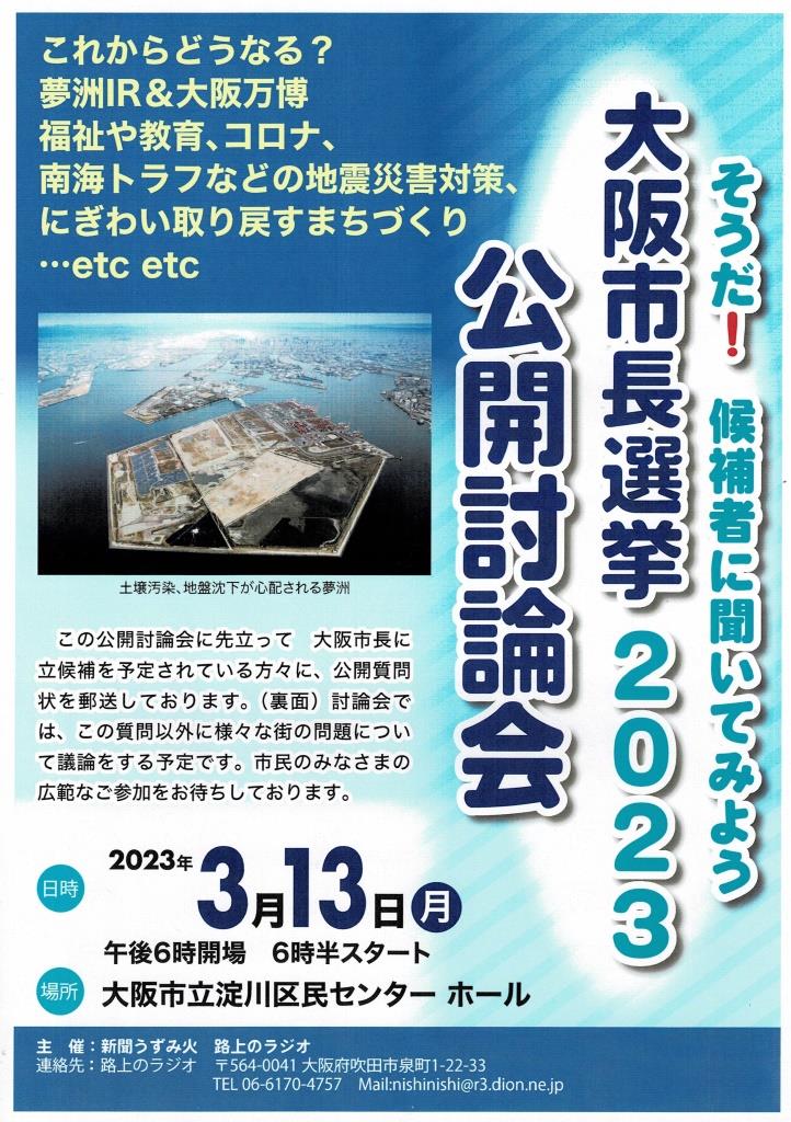 「路上のラジオ」と新聞うずみ火による「大阪市長選公開討論会」が3月13日午後6時半~大阪市立淀川区民センターで。 立候補の意向を示している北野妙子・大阪市議と横山英幸府議に趣旨を説明したところ、北野氏は出席、横山氏から欠席ハガキが先ほど届いた。当日は北野候補に聞く市民集会に。入場無料